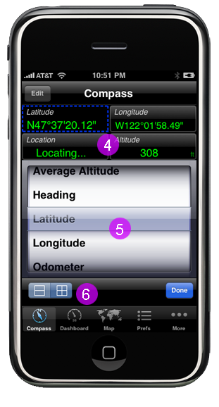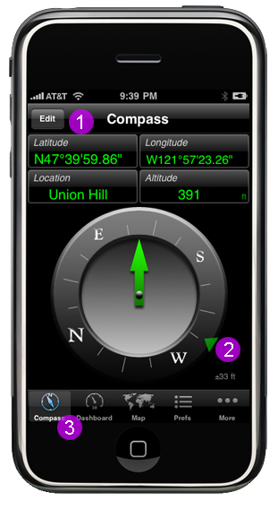 2. Current Waypoint Indicator - displayed when gpsPrime has a current waypoint - the direction relative to your current 3. Tab Bar - access other gpsPrime features |