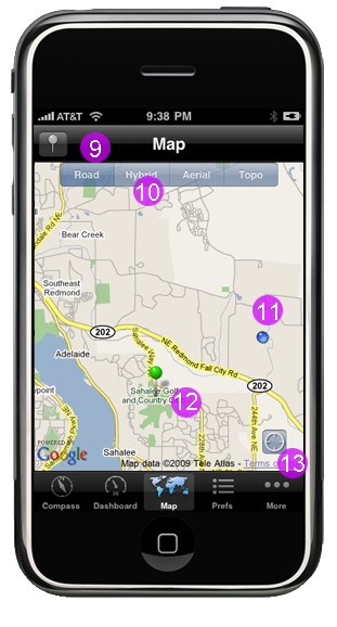 10. Map Type Selector - press to select different type of map 11. Current Position Indicator - shows where the iPhone currently is 12. Current Waypoint - green pin is 'current' point, red pins are other points 13. Track Current Button - press to have map track GPS coordinates you can pinch/zoom and drag the map to view other locations. this will temporarily disable tracking. press Track Current Button to reenable auto tracking. |