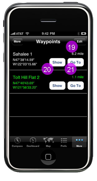 20. Show - display waypoint in Map Tab 21. Go To - display waypoint in Map Tab and sets it to current waypoint |